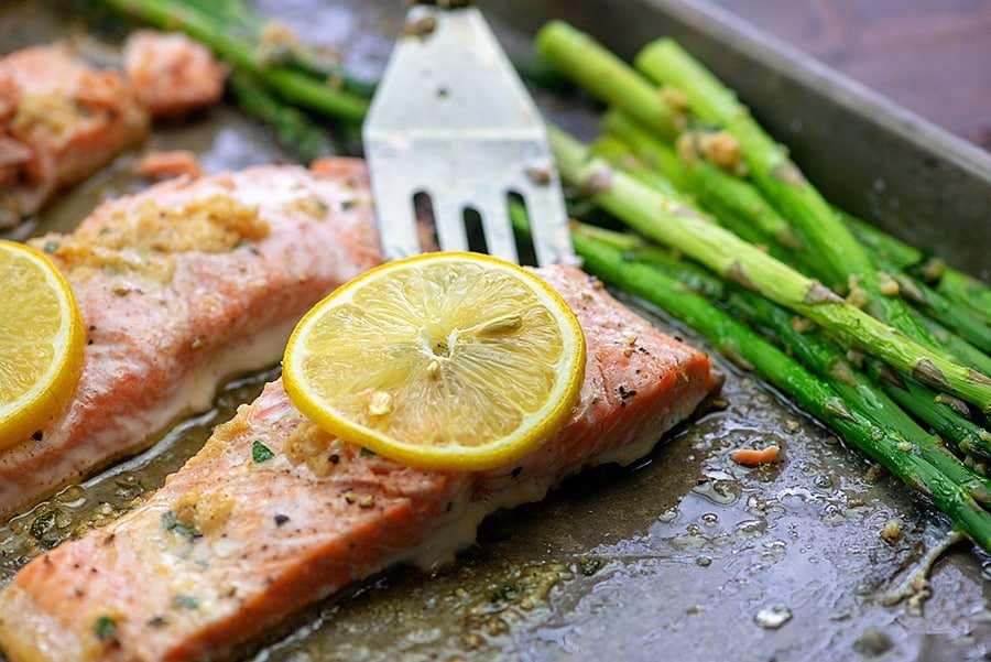 Karly says: “This oven baked salmon with garlic butter and green asparagus is a one sheet pan dinner! And that means that it is easy to prepare and you don’t need to wash up loads of pots and pans after dinner. The salmon stays juicy and flaky and those green asparagus are crisp and buttery at the same time.”
