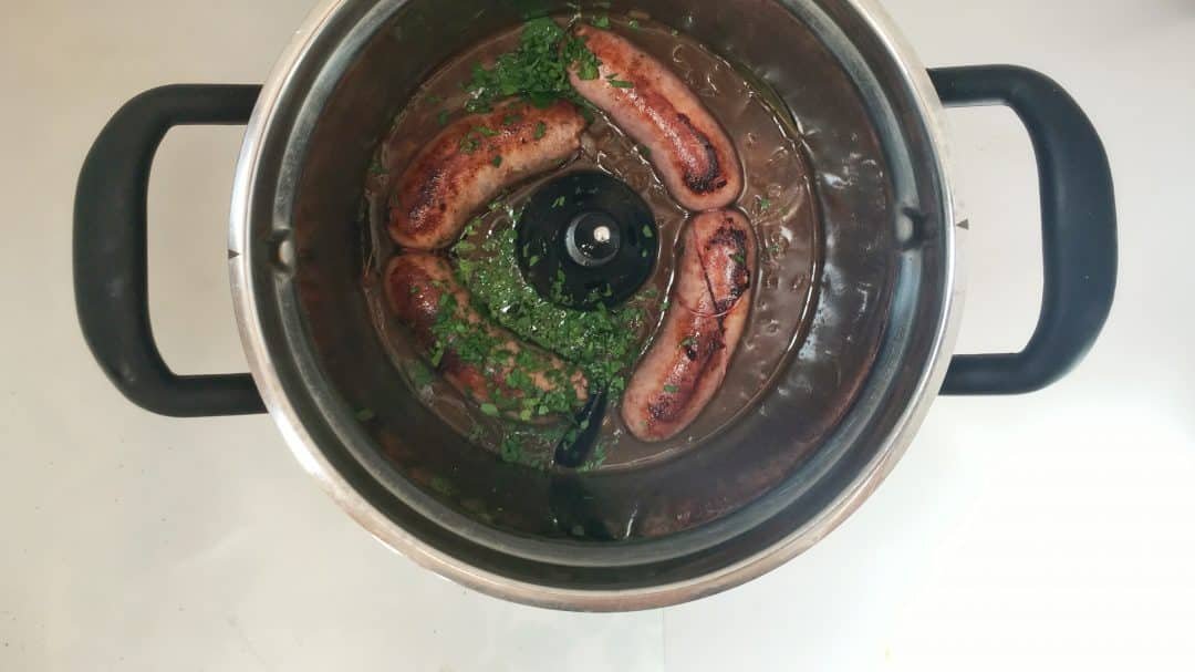Brown the sausages over medium-high heat for a couple of minutes and then take them off the heat. In the end the onion Guinness gravy should have thickened nicely. Then once the program has ended, press Cancel to exit the keep warm mode. Add the sausages and chopped parsley to the bowl and press Quick Stir for a couple of seconds.