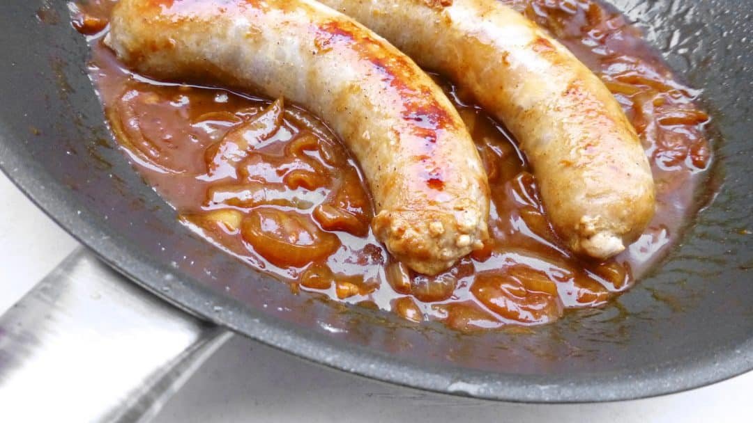 Remove the sausages to a plate and cover with some tinfoil to keep them warm. In the same hot warm pan add the remaining butter and sliced onion.