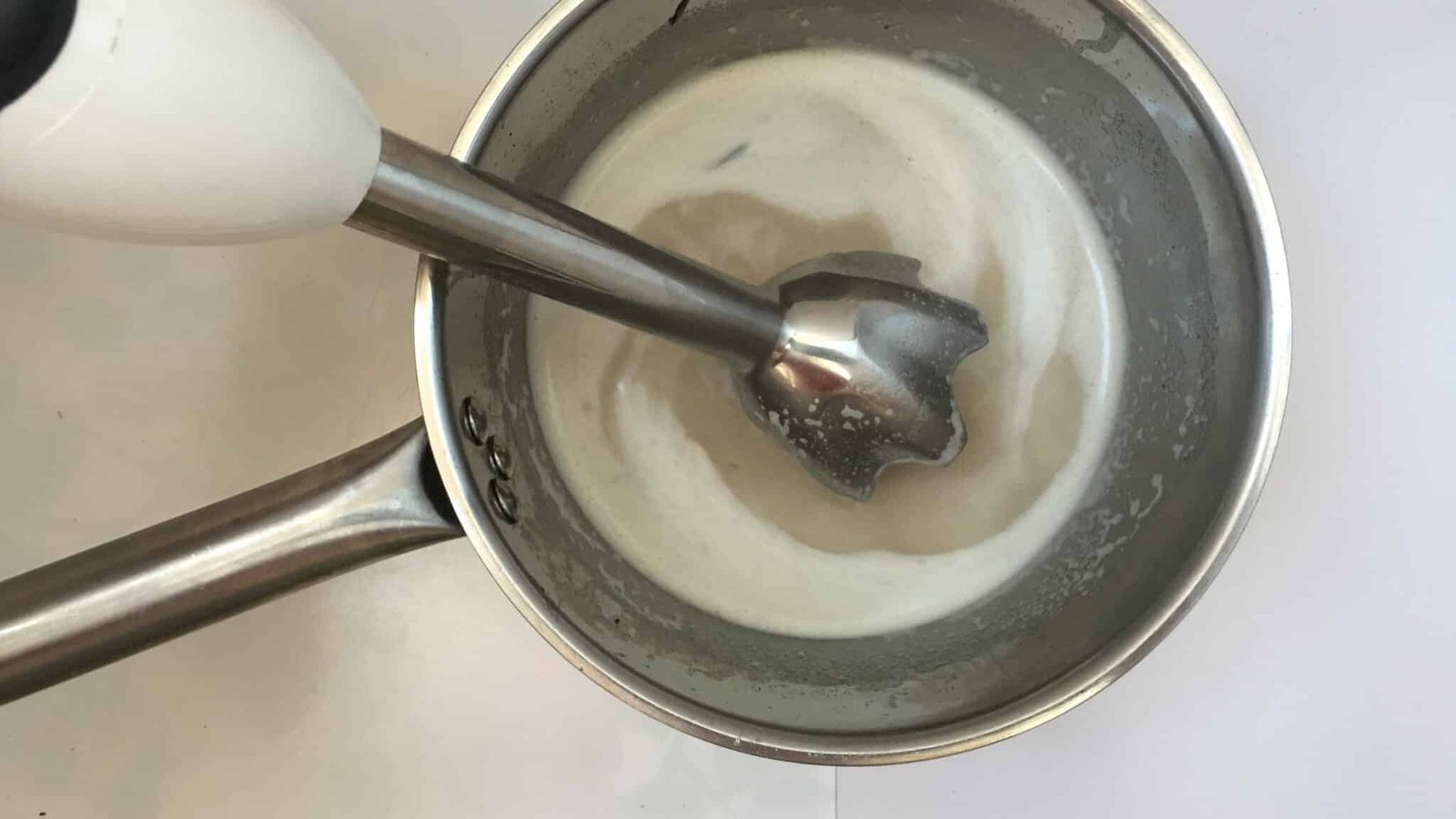 Bring the ingredients to a boil, then turn the heat lower and simmer it for 5 minutes. The stock should have reduced by almost half. Then take the pan off the heat and remove the bay leaves and rosemary. Let the stock cool and mix or blend it until smooth.